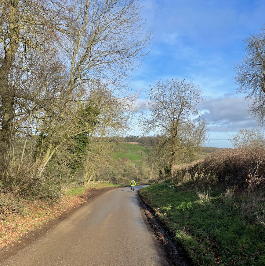 We followed the track down to a road and then along another track that brought us to the edge of Branston village. There we had a steep uphill road walk into the village where we knew there was a bus shelter with a seat – an ideal spot for a cuppa and a scotch egg.