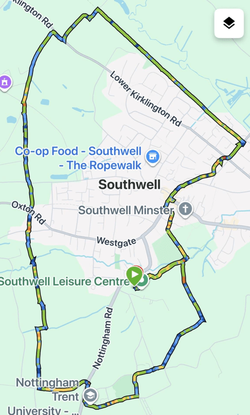 Leaving the campus we continued across fields and enjoyed views over Southwell. After following a muddy path across a field (not appreciated but could have been worse) we descended into Southwell and found our way back to the car park.