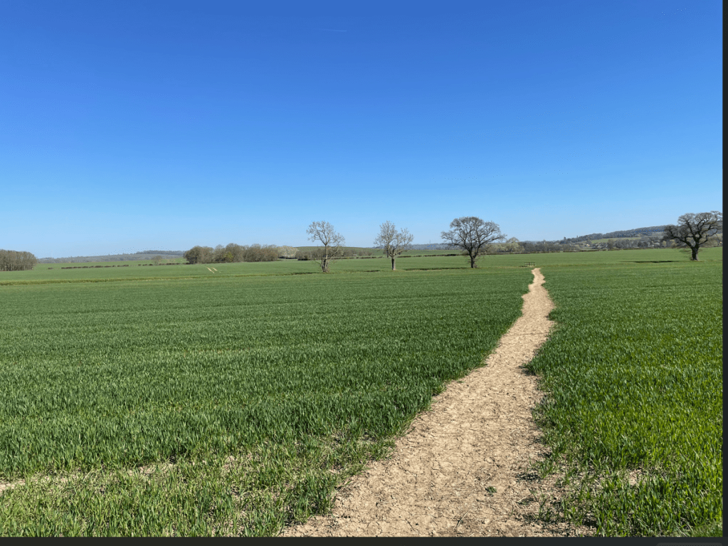 One of the Groundsmen working on the greens kindly came over to us and pointed out the route across the course – the way markings were not particularly clear. We were thankful for the guidance. After passing safely through the golf course we had some road walking to do before crossing fields of Rape (the yellow flowers were just starting to bloom) to reach The Drift.