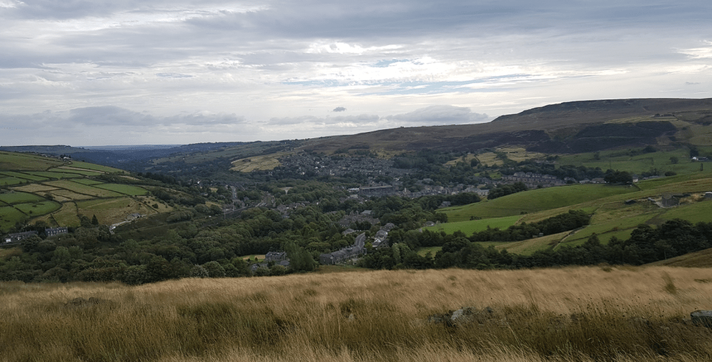 After about an hour’s drive we arrived in Marsden and found a parking spot. Marsden is nestled in a valley with the river Colne running through. Our route would take us out of Marsden (starting at the railway station) and up high looking down at the town. Returning to the town we were planning to walk beside the canal and then head up on to Marsden Moor.