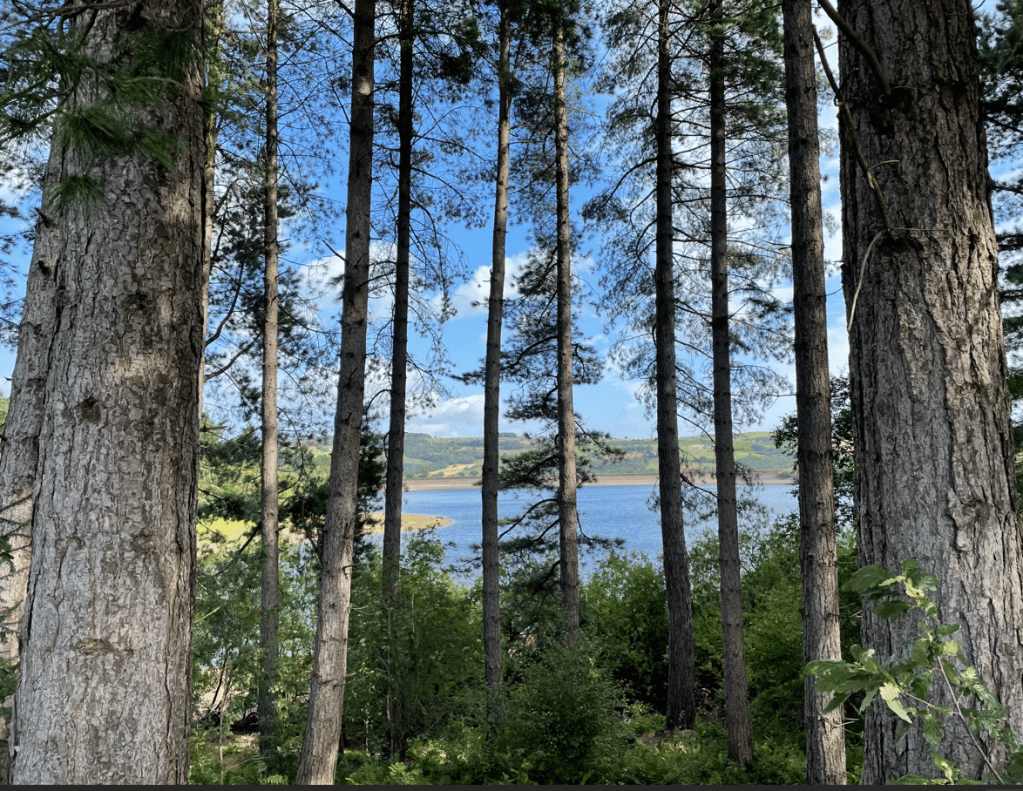 Reaching the far end of the reservoir we descended and followed a path through the woods running along side the reservoir, getting glimpses of the reservoir glinting in the sunshine below.