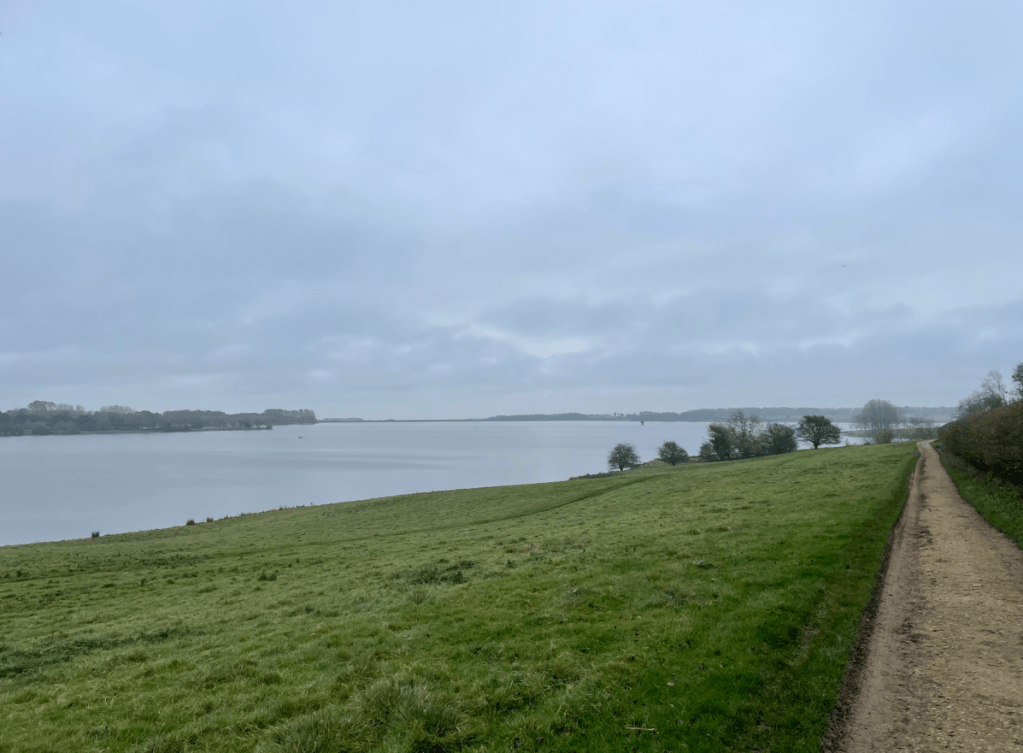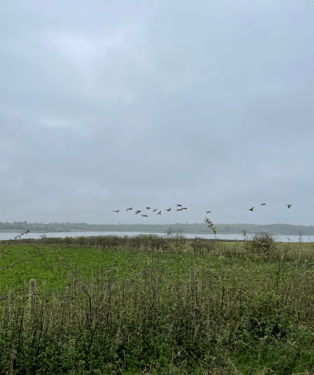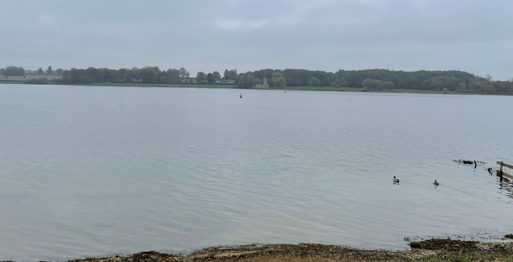 Walking down to Half moon spinney (where the peninsular ends) we had a pitstop by the water -there were two handy benches available. Across the water we could see Normanton Church (a popular wedding venue). Swans were practicing taking off and landing on the water in front of us. Canadian Geese were gathered in a field close by.