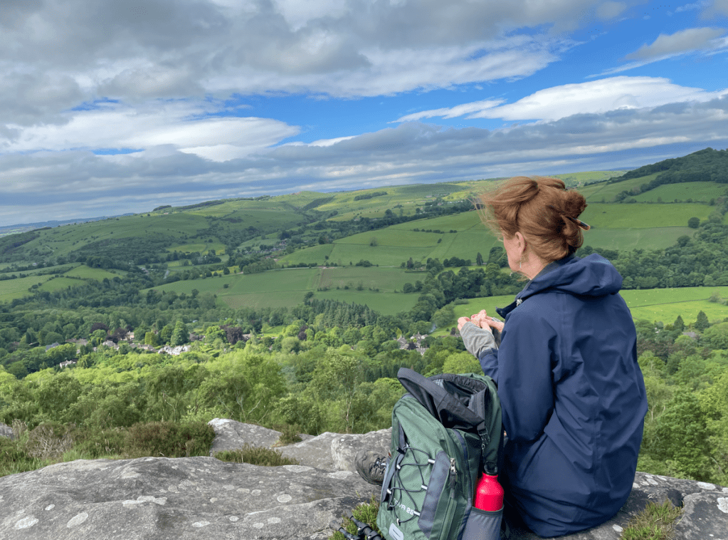 Angela taking lunch on Frogatt Edge