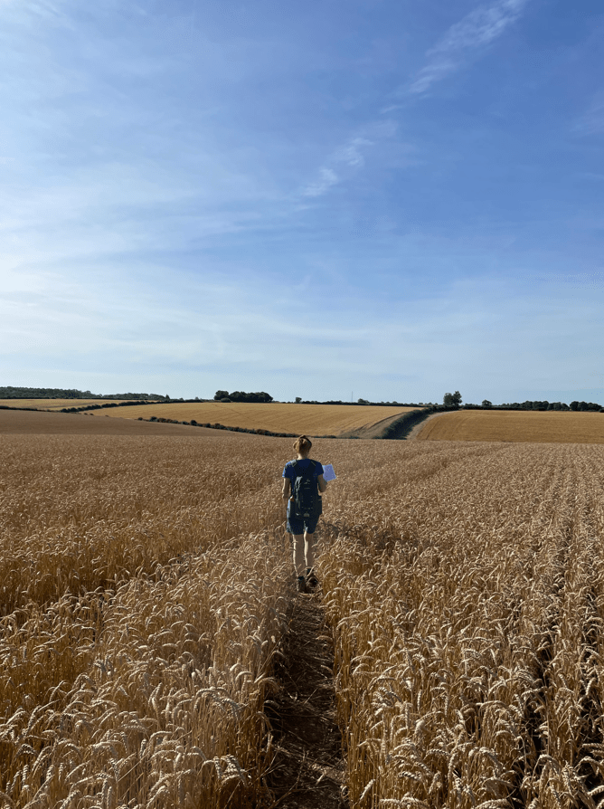 Angela leading a way through the wheat.