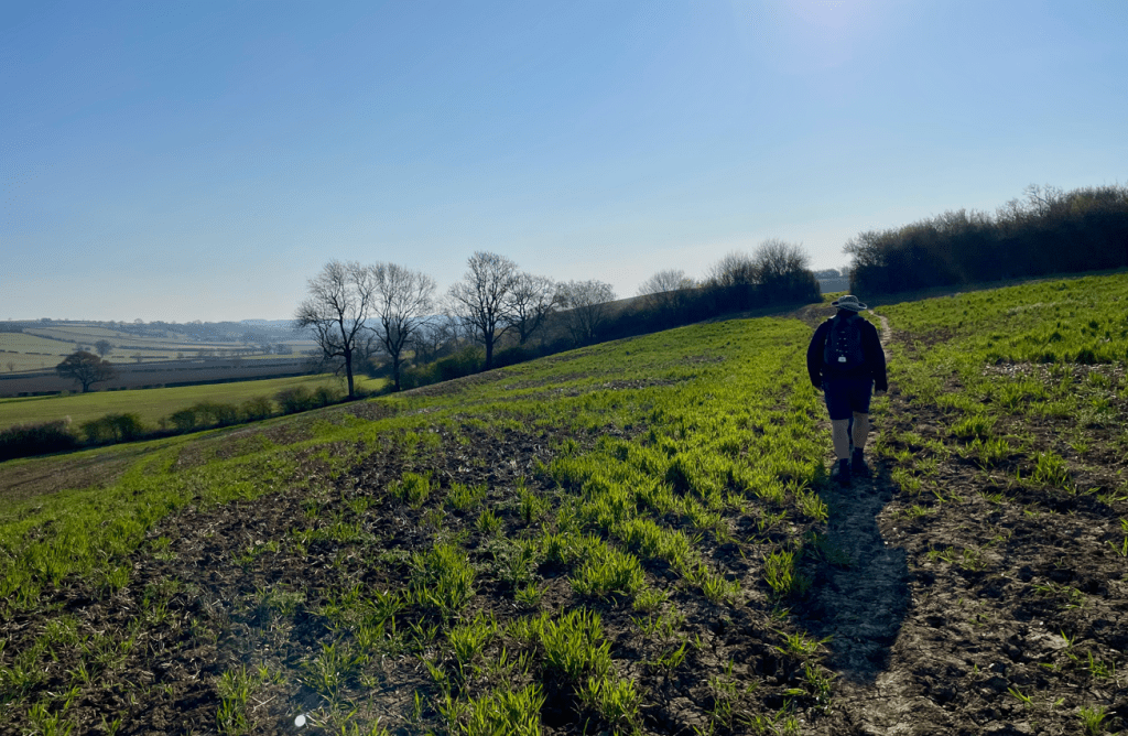 We then descended a long sloping valley pasture to the spinney at the far end. Cattle graze on this pasture and there were plenty of deep holes where the cattle’s hooves had sunk into the ground during wet weather. Today the ground was mostly rock solid- it would have been a grim section in wet conditions. Still, it was challenging enough not to trip up in the ruts.