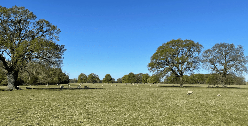 Turning off the track we crossed parkland full of mature oak trees, sheep and curious little lambs.