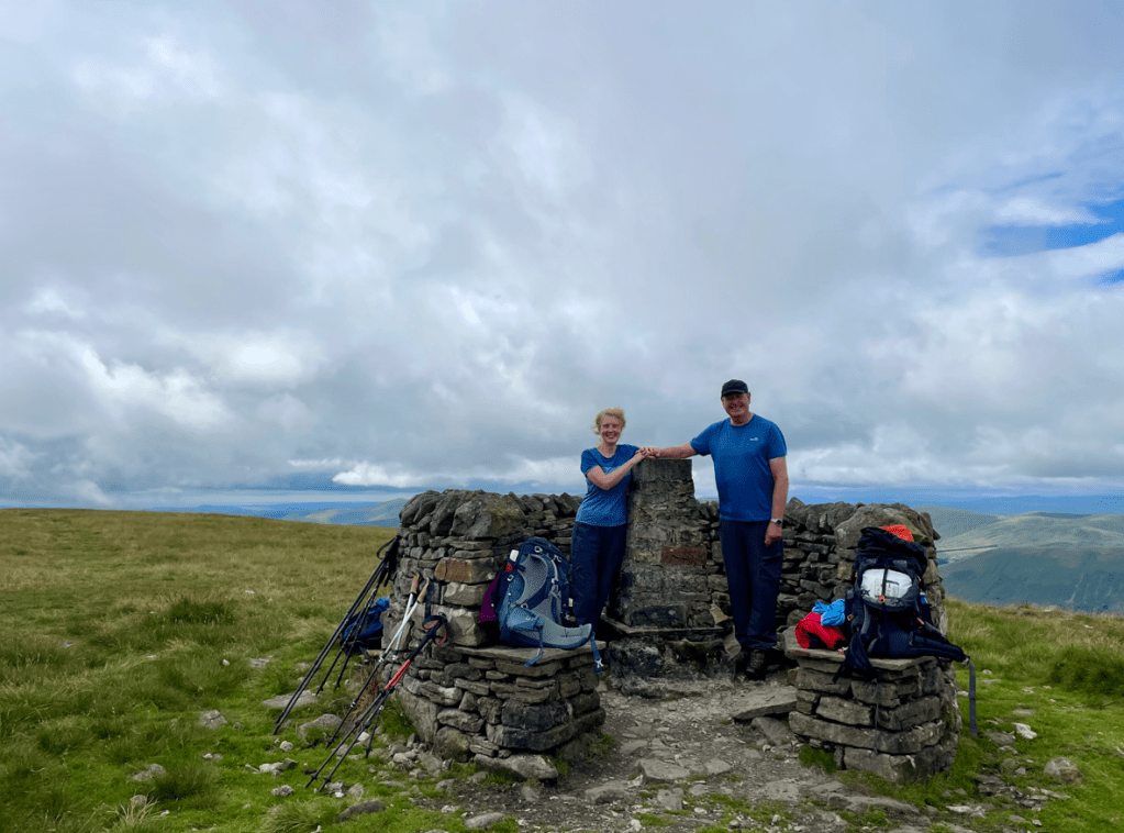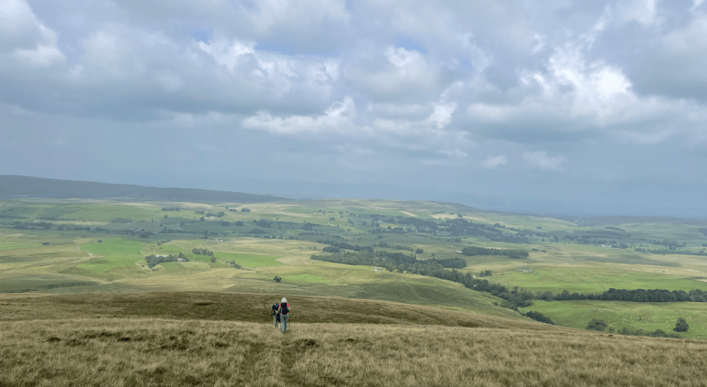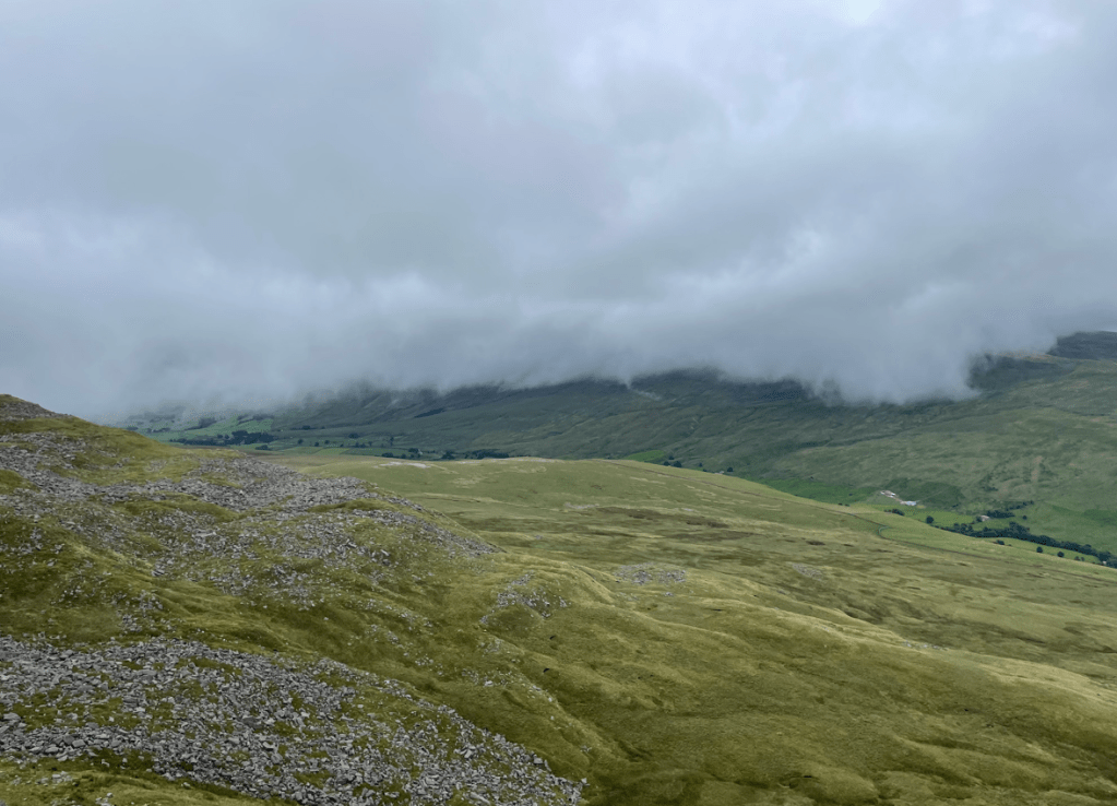 For our first walk we were part of a group of four walkers plus the leader. Starting in Garsdale we ascended, with views of Dandrymire Viaduct, to the high moorland summits of Swarth Fell and then on to Wild Boar Fell, before crossing a patchwork of fields to the village of Ravenstonedale (the numerous small stile’s got tedious towards the end). 11 miles and 1,850 ft of ascent. We ascended into mist, but when we arrived at Wild Boar Fell trig point, the cloud had lifted and we had great views across to the Howgills. We met no one apart from a group of three men – the fells were quiet.