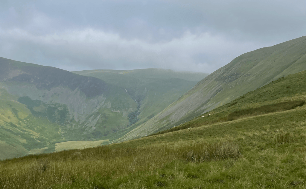 Day 3 was billed as a hard walk with 2,898 ft of ascent, so Angela wisely decided to do a less strenuous walk. Our group of four hardy walkers, and leader, set off from Cautley and had a very steep ascent straight away to Yarlside. I was huffing and puffing on the way up. We had distant views of Cautley Spout (the highest waterfall in England) on the way.