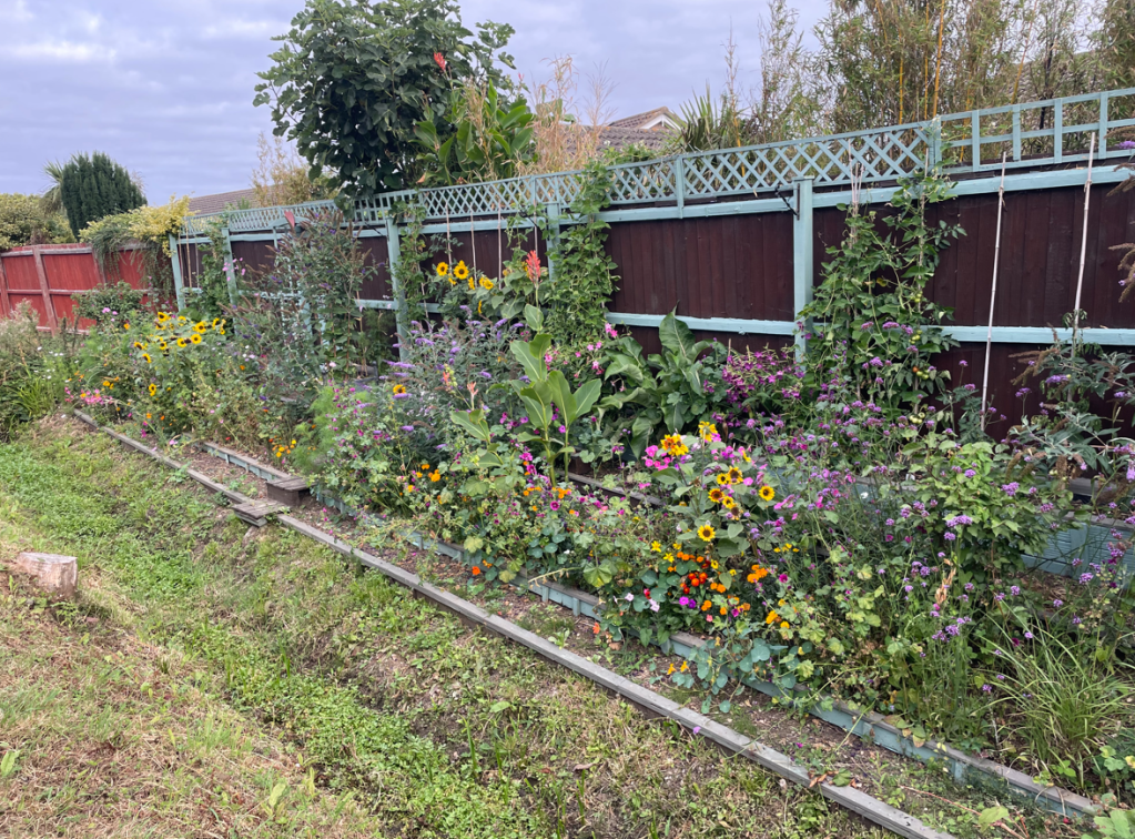 We set off through the town following a drainage ditch (bone dry) towards the woods. We passed a section where the householder had made a particular effort with maintaining the area next to the drain – it brought a smile to our faces looking at the nice flowers.