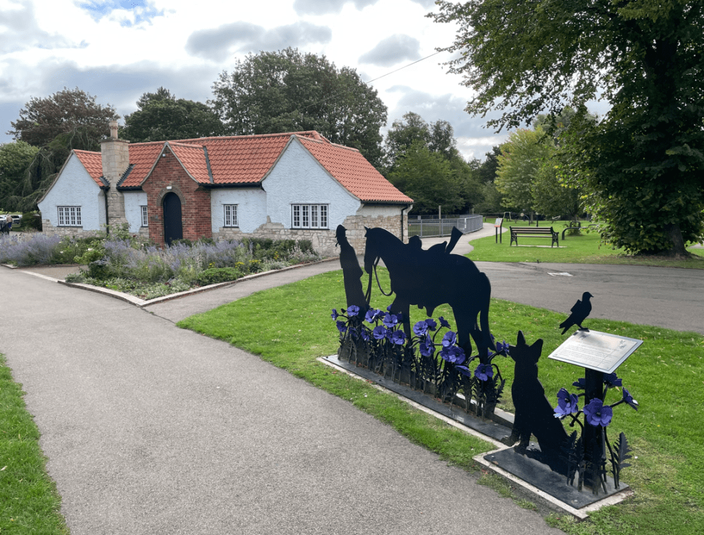 We found a memorial for animals that have been victims of war. The purple poppy is often worn to remember these animals. The sculpture is entitled ‘Wilbur’ and represents a WW1 Tommy and his faithful steed.