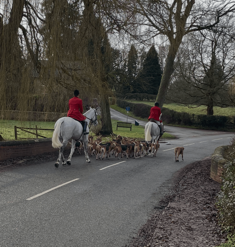 After reaching Harston we had some road walking to do to reach Knipton – it was all downhill so that was easy. We were ready for a cuppa when we reached Knipton. We sat in the bus shelter where there was a wooden bench. All three of us had chosen Bovril to fill our flasks today- must have been something to do with the weather. I tucked into my Scotch Egg – the food of Gods! Someone said ‘I can hear horses’ next thing some hounds and a couple of horsemen were passing by – I forgot about my Scotch Egg and rushed to take a photo. They were probably part of the Belvoir Hunt.