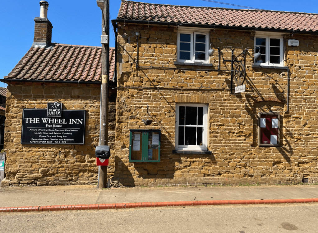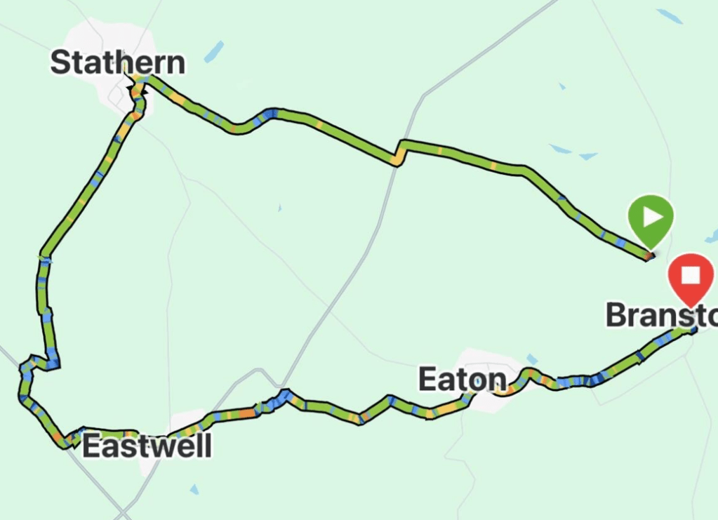 The church sits in a dominant position over the village and we noted the steeple was scaffolded out, presumably for some maintenance work. The walk had been quite undulating and we continued in this vein as we left Eaton and headed for Branston. Eventually the route levelled out and we had a flat walk back into Branston arriving through the grounds of the pub – ‘The Wheel Inn’.