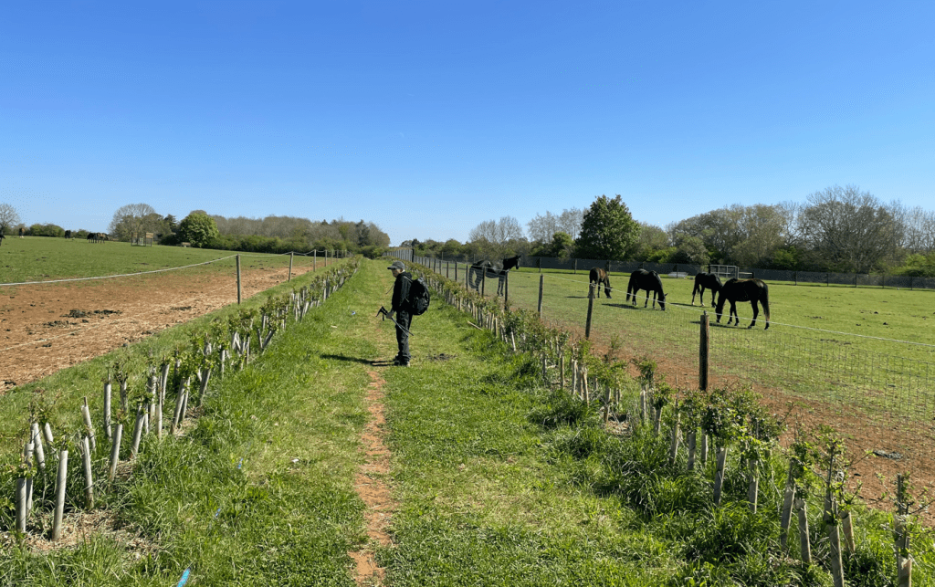 Having crossed the fields we ended on a road and had a short , but perilous, section of walking uphill against speeding traffic. Pleased to be off the road, we crossed more fields to arrive into the village of Eastwell and blue skies. We paused at a bus shelter for a break, where a passing horse rider bade us a good morning.